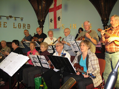 SMUG did a rousing and mighty performance at Whisperwood Villa in Charlottetown yesterday afternoon. It was our first visit to Whisperwood and we all hope we will be invited to return. The residents turned out in full force, clapped and sang along with everything we played, plus we had some of them playing the ukulele before the afternoon was over. This was a real highlight as we know Leah and Darlene are planning to teach a ukulele group there after Christmas and this was surely great advertisement for the January challenge. There were once again familiar faces in the gathering at Whisperwood and many of us had an opportunity to chat with many of the residents.We had been introduced after our customary "Smug Ukulele Band" by Kerry Trenholm, the assistant activity director, and Peggy Zielinski, the activity director was gracious in her thanks to us for being there for the first time. One of the other highlights, for me at least, was the "apple for the teacher" given to me by Joanne. A photo appears at the beginning of this blog!